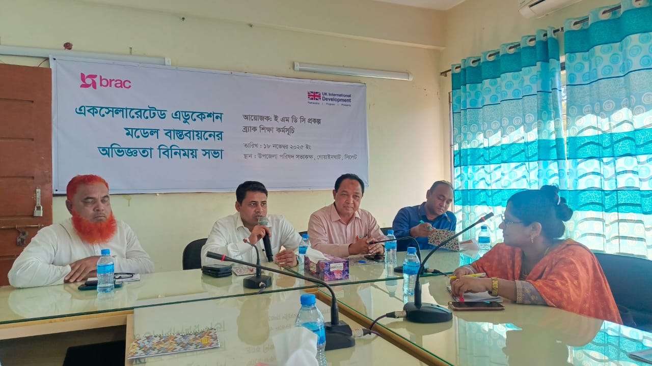 গোয়াইনঘাট (সিলেট) প্রতিনিধিঃ সিলেটের গোয়াইনঘাটে ব্র্যাক একসেলারেটেড এডুকেশন মডেল বাস্তবায়নের অভিজ্ঞতা বিনিময় সভা অনুষ্ঠিত হয়েছে। মঙ্গলবার (১৮ নভেম্বর) সকাল ১১টায় গোয়াইনঘাট উপজেলা পরিষদ সভাকক্ষে ই এম ডি সি প্রকল্প ব্র্যাক শিক্ষা কর্মসূচির আয়োজনে সিলেট বিভাগীয় ব্যাবস্থাপক (ব্র্যাক) আমেনা আক্তারের সভাপতিত্বে ও কর্মসূচি সংগঠক মোহাম্মদ আরিফুল আহমেদের পরিচালনায় প্রধান অতিথি হিসাবে উপস্থিত ছিলেন গোয়াইনঘাট উপজেলা নির্বাহী অফিসার রতন কুমার অধিকারী। অনুষ্ঠানে বিশেষ অতিথি হিসাবে উপস্থিত ছিলেন উপজেলা প্রাথমিক শিক্ষা অফিসার ইফতেখার হোসেন ভুঁইয়া, গোয়াইনঘাট প্রেসক্লাব সভাপতি মনজুর আহমদ, উপজেলা সহকারী অফিসার বশির শরীফ,