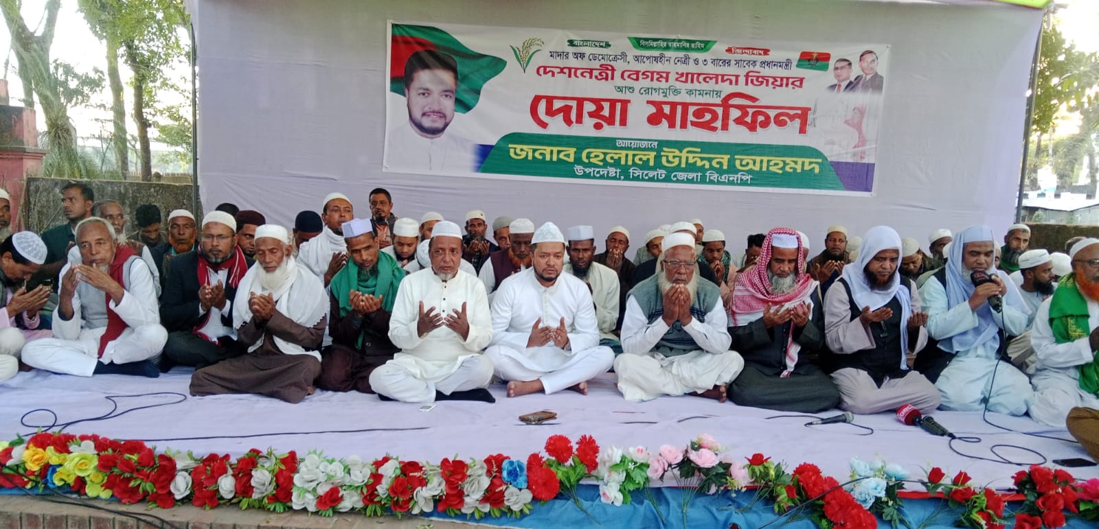 বিএনপি চেয়ারপার্সন ও সাবেক প্রধানমন্ত্রী বেগম খালেদা জিয়ার সুস্থতা কামনায় গোয়াইনঘাটে জেলা বিএনপির উপদেষ্টা হেলাল উদ্দিন আহমেদর উদ্যোগে খতমে কুরআন ও দোয়া মাহফিল অনুষ্ঠিত হয়েছে।