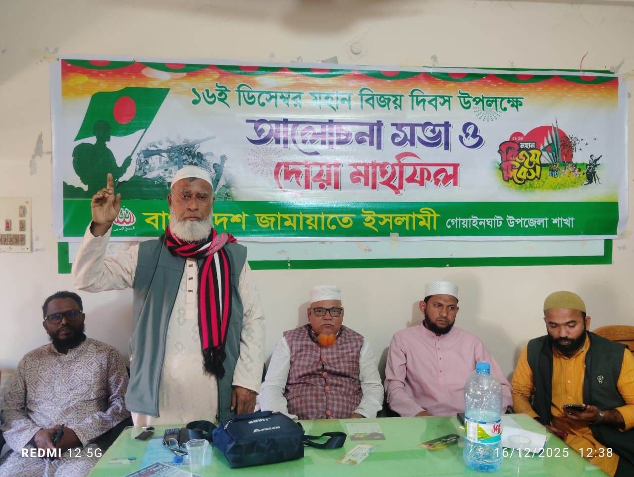 ১৬ ই ডিসেম্বর মহান বিজয় দিবস উদযাপন উপলক্ষে আলোচনা সভা ও দোয়া মাহফিল করেছে বাংলাদেশ জামায়াতে ইসলামী গোয়াইনঘাট উপজেলা শাখা।