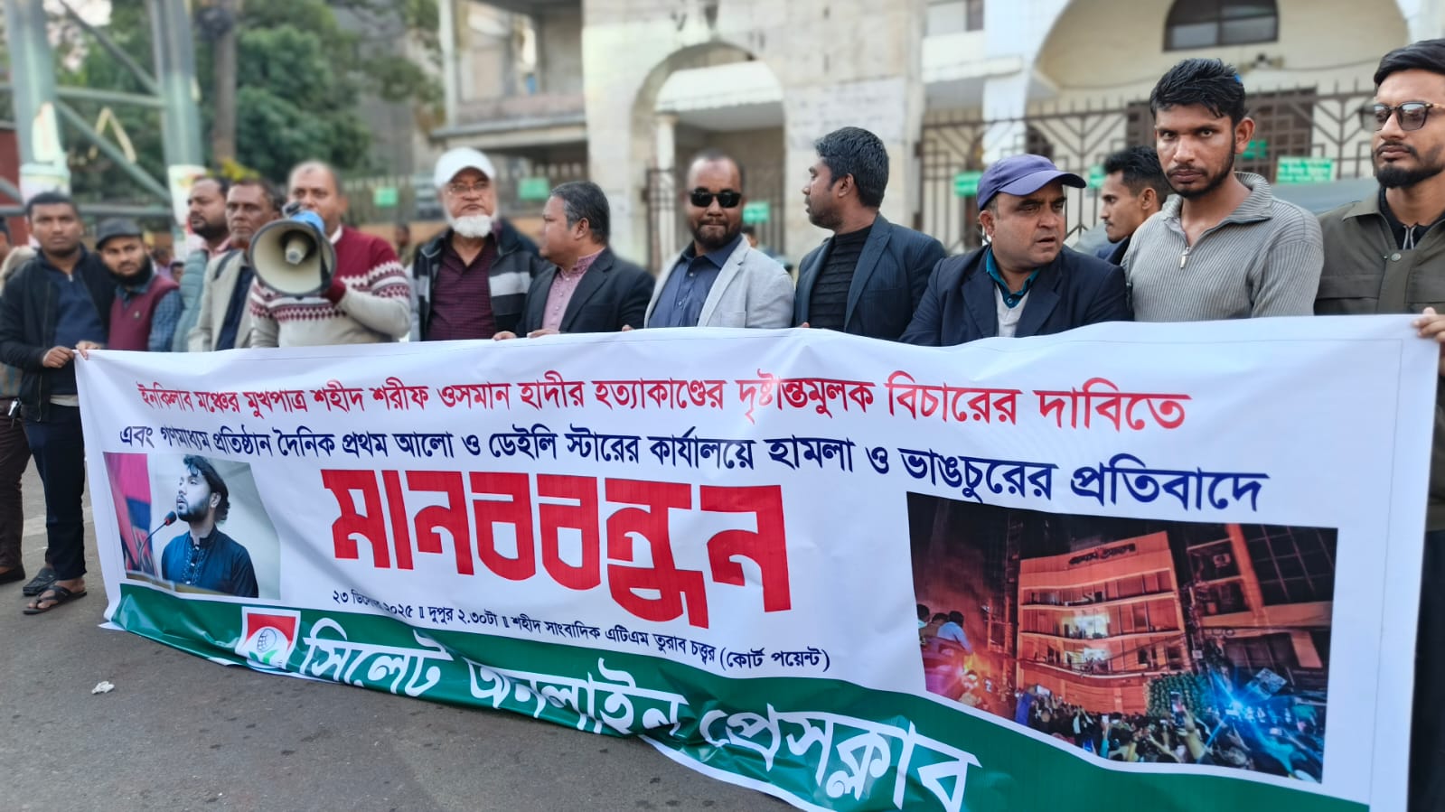 ইনকিলাব মঞ্চের মুখপাত্র শহীদ শরীফ ওসমান হাদীর হত্যাকাণ্ডের দৃষ্টান্তমূলক বিচারের দাবিতে এবং গণমাধ্যম প্রতিষ্ঠান দৈনিক প্রথম আলো ও ডেইলি স্টার কার্যালয়ে হামলা ও ভাঙচুরের প্রতিবাদে সিলেট অনলাইন প্রেসক্লাবের উদ্যোগে মানববন্ধন অনুষ্ঠিত হয়েছে।