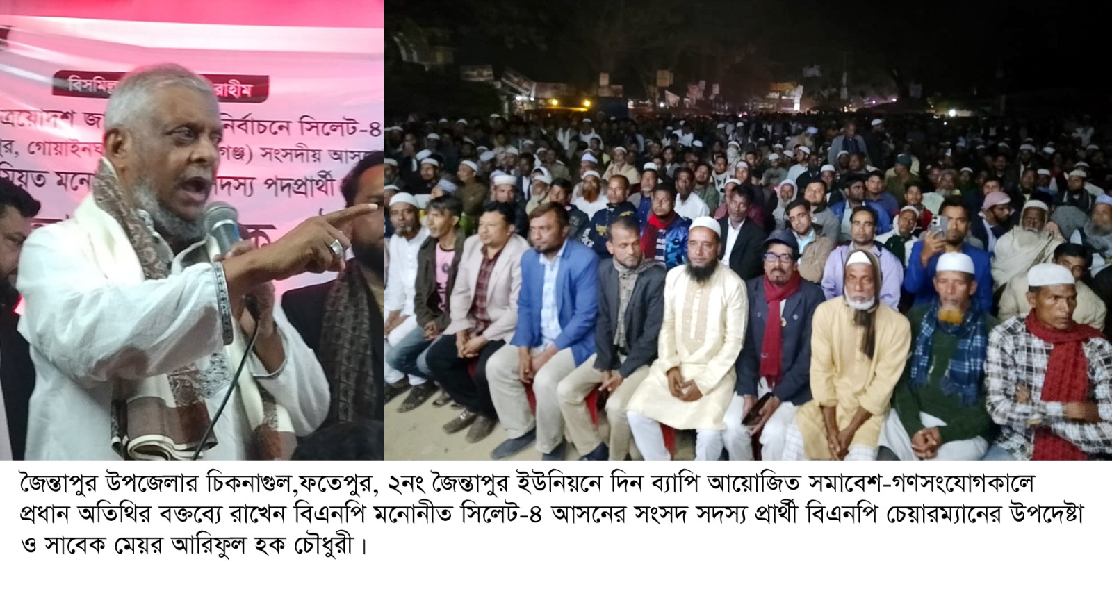 মঙ্গলবার (২৭ জানুয়ারী) জৈন্তাপুর উপজেলার চিকনাগুল ইউনিয়ন, ৫নং ফতেপুর (হরিপুর) ইউনিয়ন ও ২নং জৈন্তাপুর ইউনিয়নে দিন ব্যাপি আয়োজিত সমাবেশ-গণসংযোগকালে প্রধান অতিথির বক্তব্যে তিনি এ কথাগুলো বলেন।