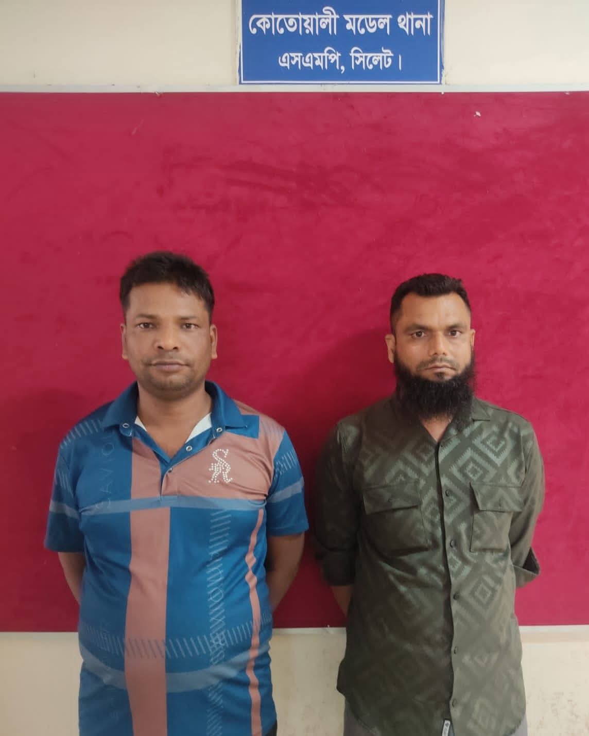 ধৃত আসামিরা হলো-১। মোঃ ইউসুফ মিয়া (৩৬), পিতা-মৃত শেখ আব্দুস সোবহান, মাতা-ফিরোজা খাতুন, সাং-চেঙ্গাটি, থানা-বাজিতপুর, জেলা-কিশোরগঞ্জ; বর্তমানে-ছড়ারপাড়, কমিশনারের কলোনী, থানা-কোতোয়ালী, জেলা-সিলেট ও ২। আব্দুল ছাত্তার (৩৭), পিতা-মৃত কফিল উদ্দিন শেখ, মাতা-আফেলা বেগম, সাং-সাদেকপুর, থানা-ভৈরব, জেলা-কিশোরগঞ্জ; বর্তমানে-তালতলা, থানা-কোতোয়ালী, জেলা-সিলেট।